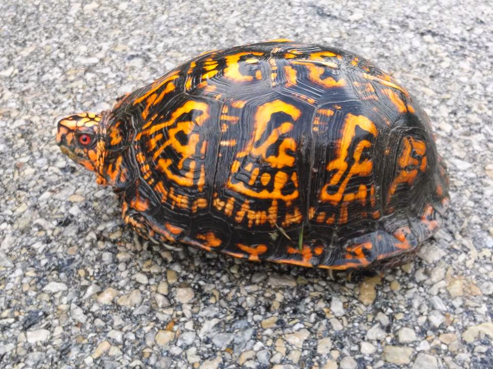 Heading out of the park, the sky lightened and the clouds began to clear. As I rounded a turn, I saw a big red-orange box turtle in the middle of the road holding his head straight up and all the way out. I'm guessing to get away from all the water. I stopped in the middle of the road and as I approached him, he tucked his head back. Picking him up, I located a spot off the road that was a little higher and clear of the water and gently relocated him.